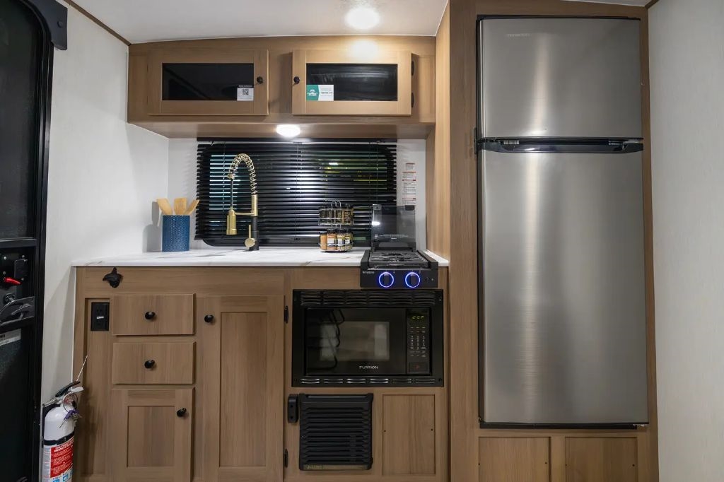 VACUUM-BONDED LAMINATED AZDEL FIBERGLASS SIDEWALLS, REAR WALL AND CROWNED ROOF - LAMINATED ALUMINUM FRAME FLOOR - FIBERGLASS FRONT CAP W/ WINDOW - LED LIGHT & STONE GUARD - ALUMA-CAGE CONSTRUCTION - ENCLOSED UNDERELLY W/ FORCED AIR/HEAT - SLIDE SYSTEM - ALUMINUM RIMS - LADDER PREP - CAST IRON GRIDDLE - MOUNTED WIRELESS BLUETOOTH SPEAKER - STABLIZER JACKS - LP PORT - TANKLESS WATER HEATER - H/C OUTSIDE SHOWER - BLACK TANK FLUSH - SWING AWAY ASSIST HANDLE - FRICTION HINGE ENTRY DOOR - SOLID STEP - MAGNETIC BAGGAGE DOOR CATCH - HARD VALANCES W/ ROLLER SHADES - LED INTERIOR LIGHTS - AIR FRYER MICROWAVE - 2 BURNER COOK TOP - 10 CU FT 12V REFRIGERATOR - SINGLE SINK W/ COVER - ACCESS DOORS UNDER DINETTE - FRAME RECEIVER PREP - DIGITAL TV ANTENNA W/ CABLE CONNECTION - SHOWER/TUB SURROUND - SKYLIGHT IN BATH - MATTRESS W COVER - BACKUP CAMERA MOUNT - BATTERY DISCONNECT SWITCH